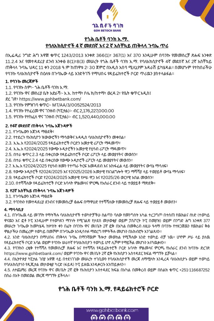 የጎሕ ቤቶች ባንክ አ.ማ. የባለአክሲዮኖች 4ኛ መደበኛ እና 2ኛ አስቸኳይ ጠቅላላ ጉባኤ ጥሪ